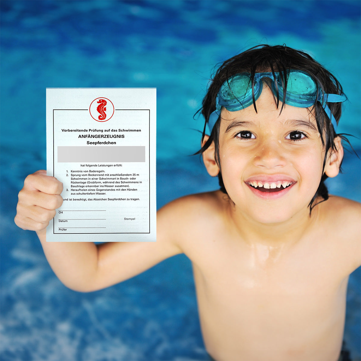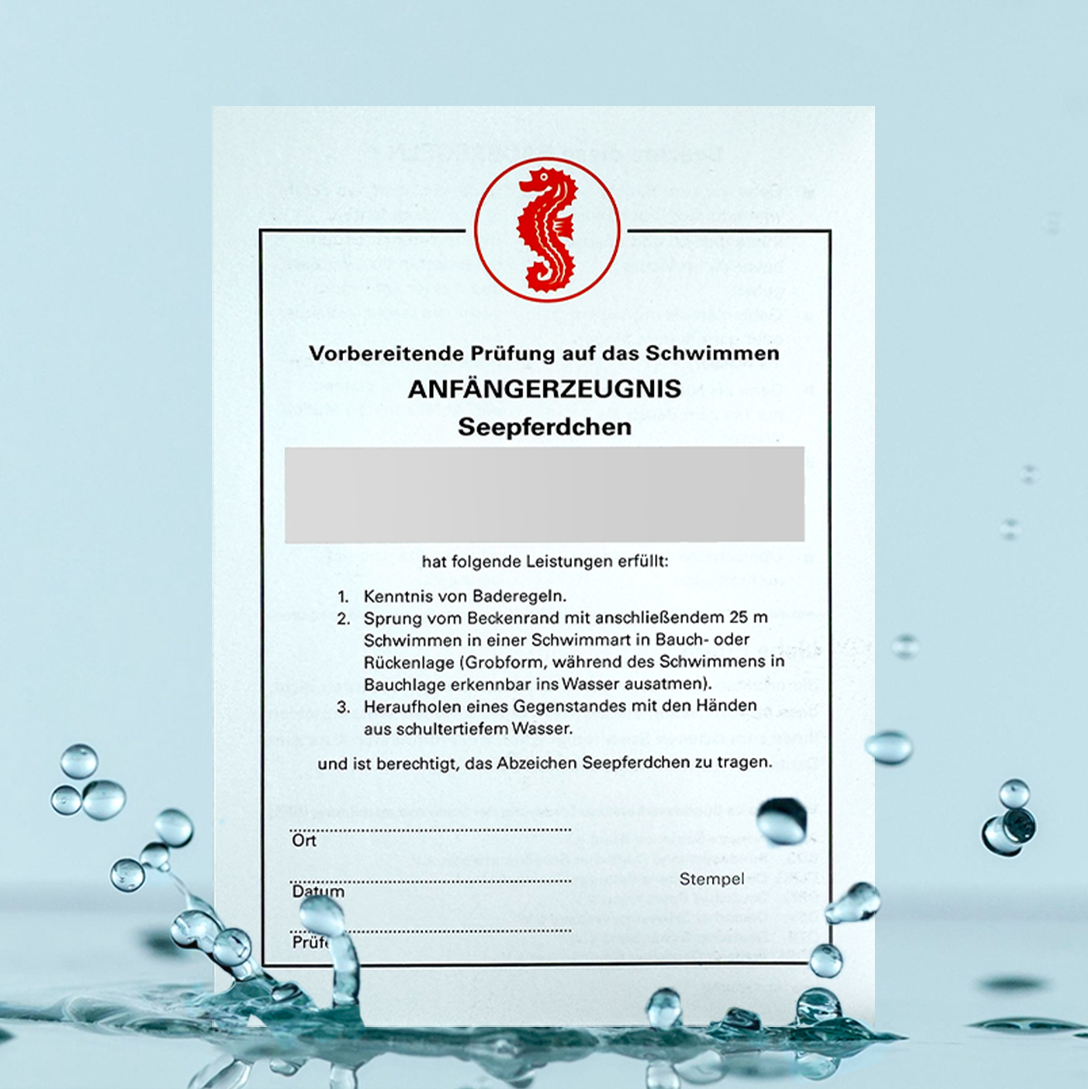 - Sprung vom Beckenrand mit anschließendem 25 m Schwimmen in einer Schwimmart in Bauch- oder Rückenlage. (Grobform, während des Schwimmens in Bauchlage erkennbar ins Wasser ausatmen)